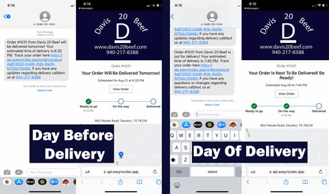 You will receive a text notification the day before your order will be delivered. You will also receive a text when your order is out for delivery. Both text will include a link for you to track your order and estimated delivery time